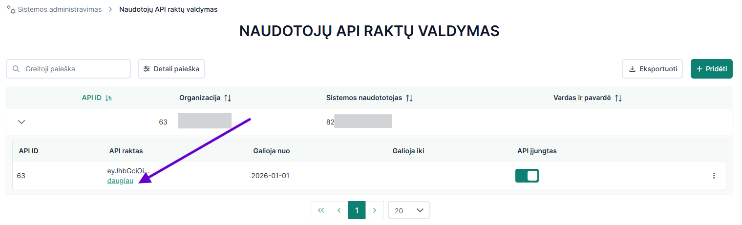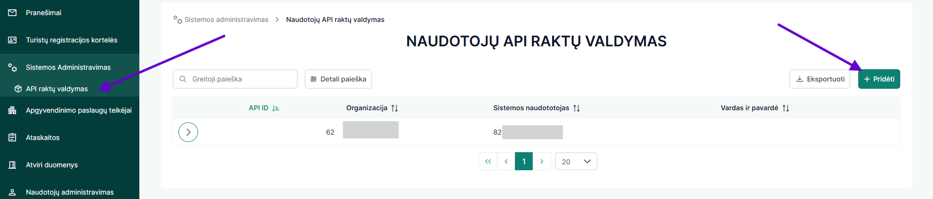 Prisijungę eikite į meniu „Sistemos administravimas“ → „API raktų valdymas“. Tada spauskite „Pridėti“, kad sukurtumėte naują API raktą.