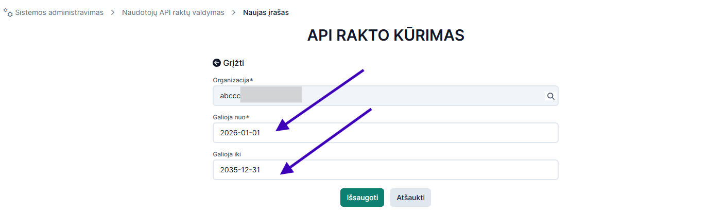 Atsidariusiame lange pasirinkite API rakto pradžios ir pabaigos datas. Rekomenduojama pasirinkti laikotarpį, kuris atitinka planuojamą integracijos naudojimo laiką. Išsaugokite duomenis.