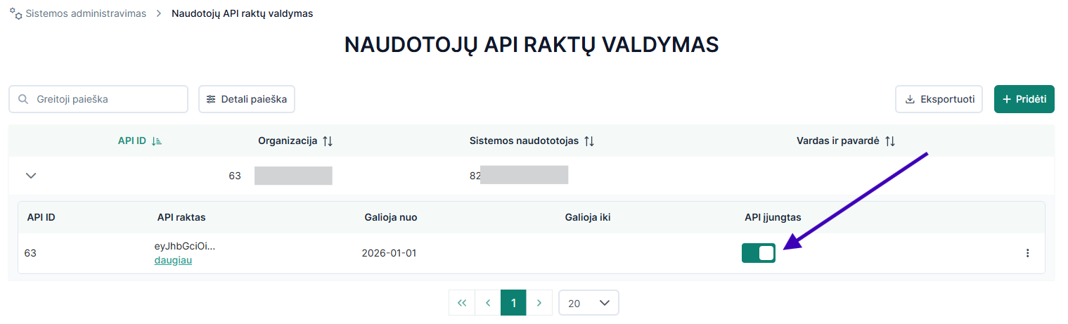 • API raktas sukuriamas, bet lieka neįjungtas.