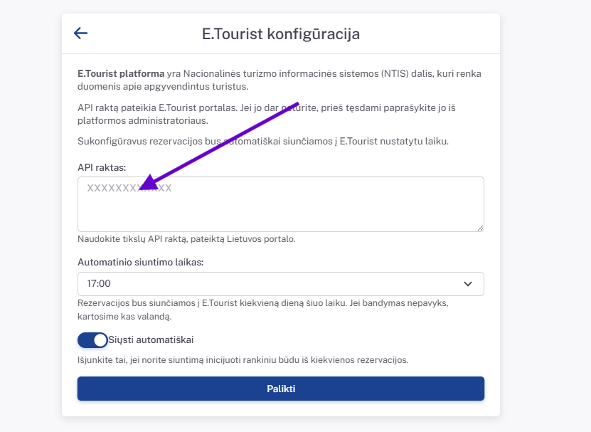Atidarykite Eurocheckin e.Turistas konfigūraciją ir įklijuokite nukopijuotą reikšmę į lauką „API raktas“. Jei reikia, pasirinkite automatinio siuntimo laiką, įjunkite automatinį siuntimą ir spauskite „Palikti“.